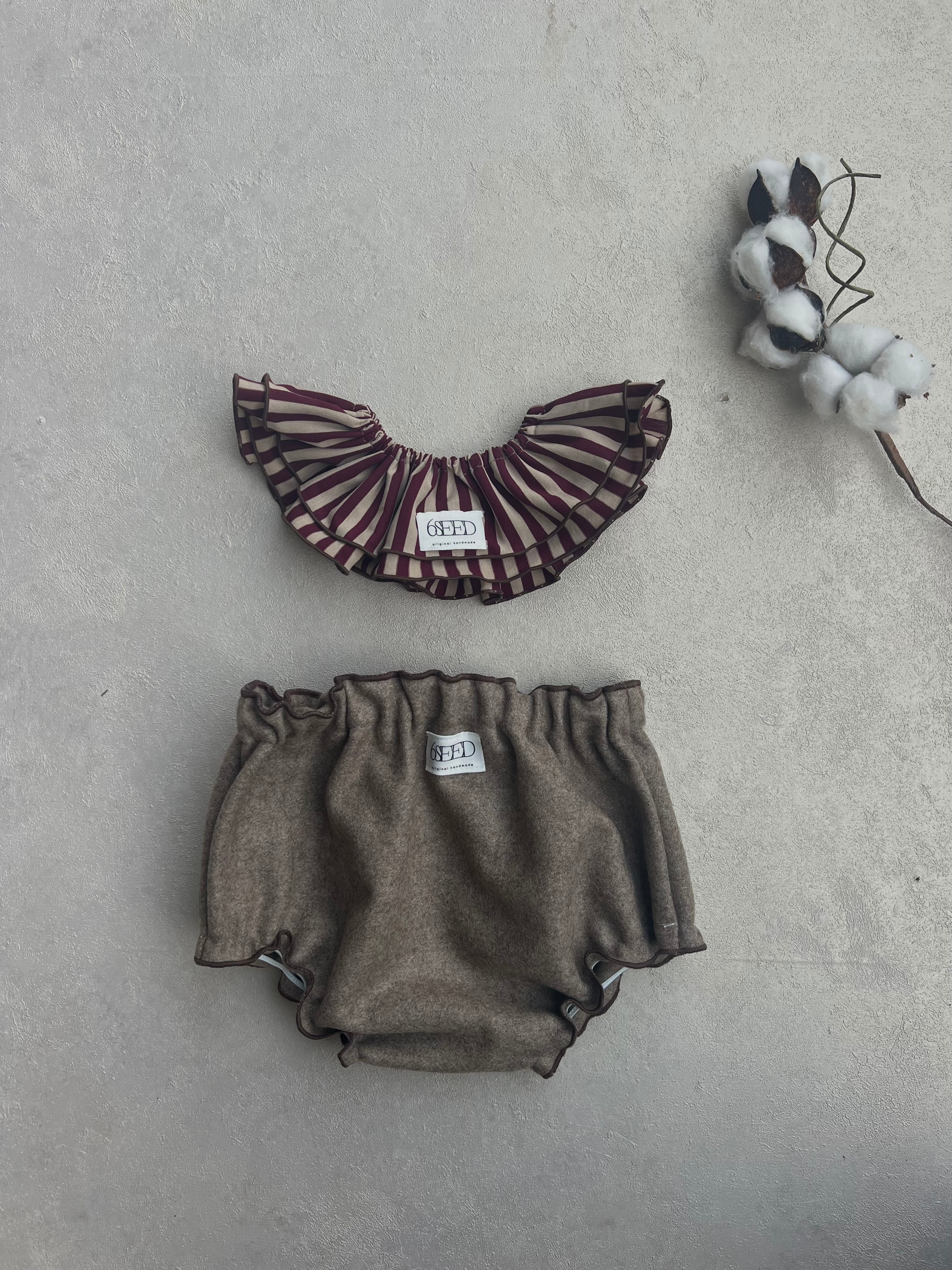 フェルトっぽい ウール風の質感で厚みもあるのでボリュームが出るので、シンプルなのに一枚で着こなせちゃうパンツです。